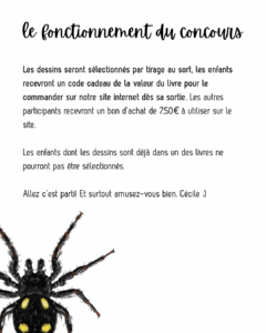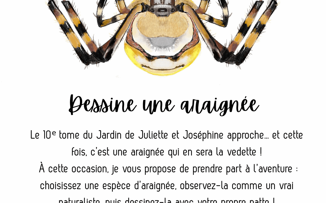 Le 10ᵉ tome du Jardin de Juliette et Joséphine approche… et cette fois, c’est une araignée qui en sera la vedette ! À cette occasion, je vous propose de prendre part à l’aventure : choisissez une espèce d’araignée, observez-la comme un vrai naturaliste, puis dessinez-la avec votre propre patte ! Qu’elle soit précise, poétique ou audacieuse, votre illustration pourrait bien trouver sa place dans le livre… Parce qu’observer, c’est déjà aimer. Et dessiner, c’est protéger. Alors à vos crayons, vos loupes et vos pinceaux !