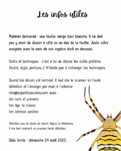 MatĂ©riel demandĂ© : une feuille vierge bien blanche. Il ne doit pas y avoir de dessin Ă cĂ´tĂ© ou au dos de la feuille. Juste votre araignĂ©e avec le nom de son espèce Ă©crit en dessous.Outils et techniques : c’est Ă toi de choisir tes outils prĂ©fĂ©rĂ©s (feutre, stylo, peinture…). N’hĂ©site pas Ă mĂ©langer les techniques.Quand ton dessin est terminĂ©, il faut me le scanner en haute dĂ©finition et l’envoyer par mail Ă l’adresse : info@lespetitszecolos.com avec : ton nom et prĂ©nom,