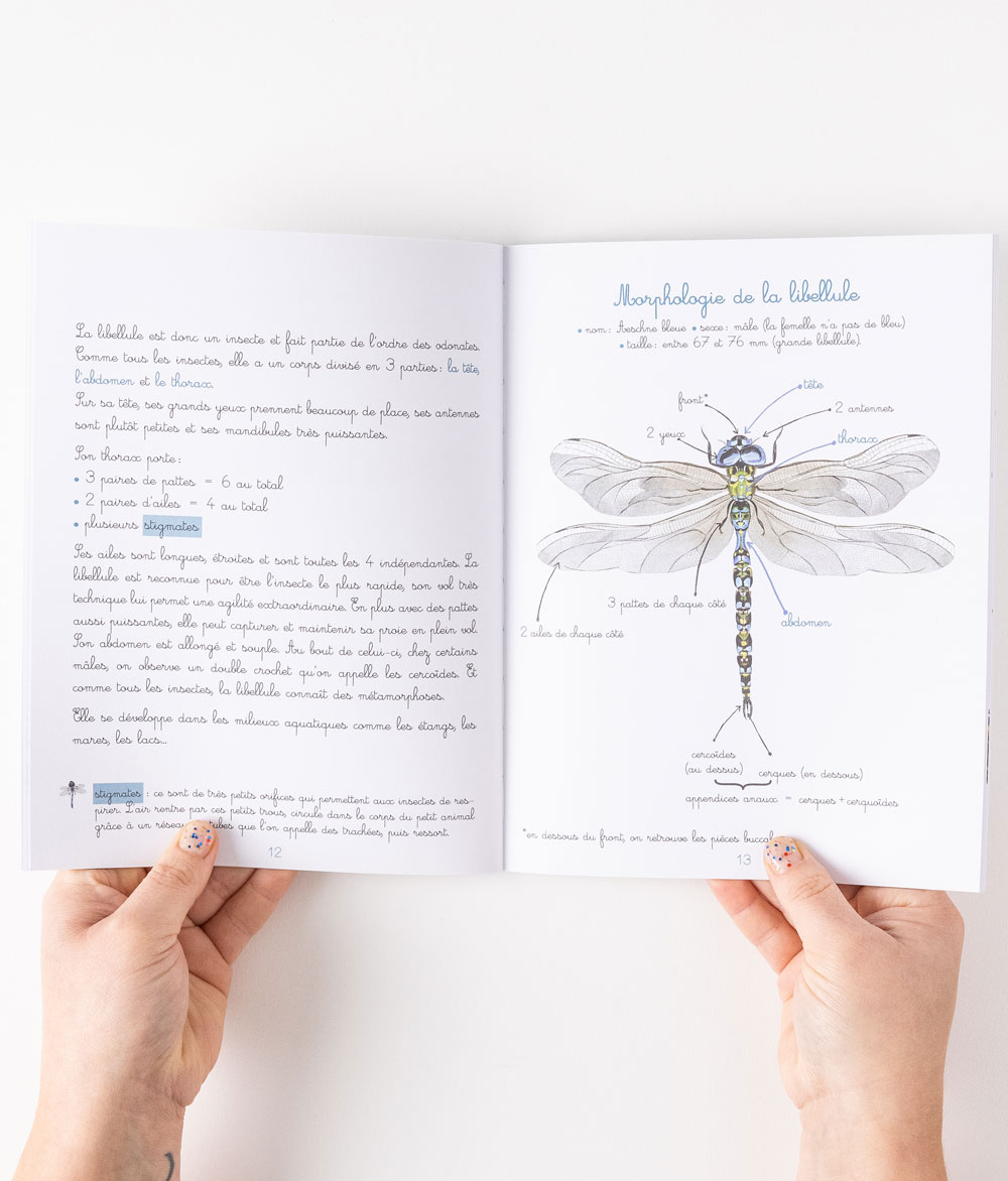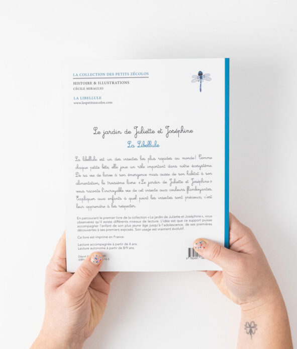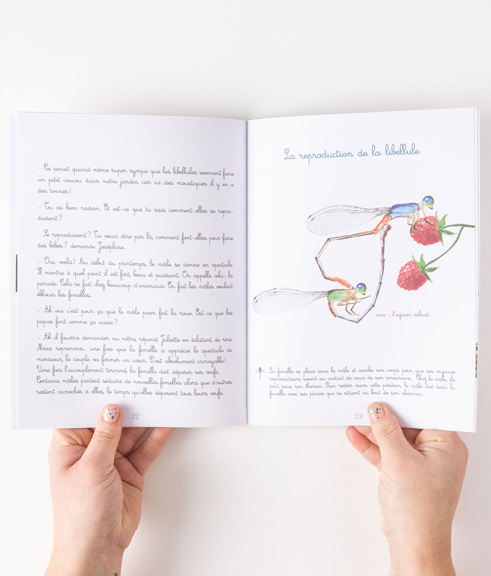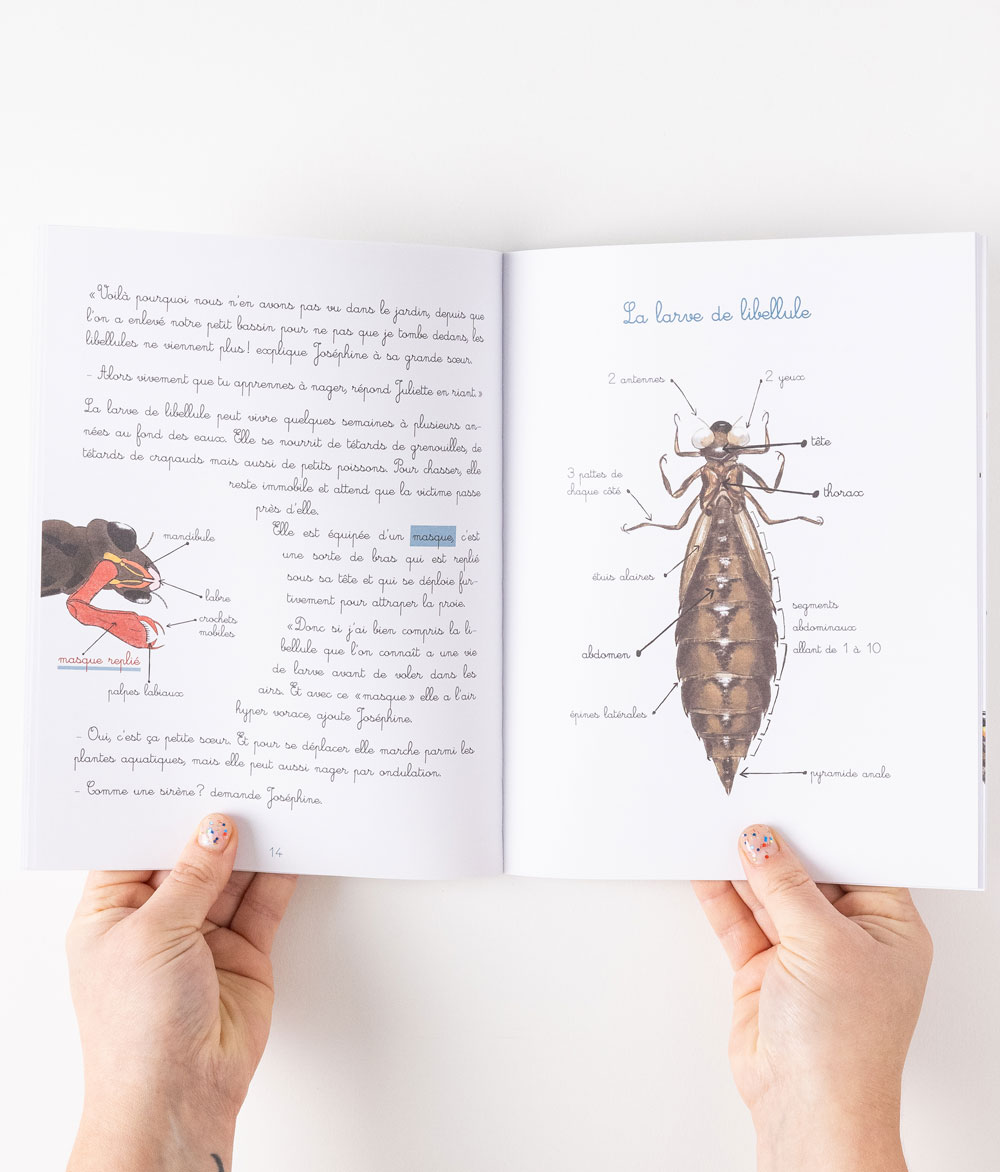 Pour ce troisième livre, nous retrouvons les deux sœurs qui partent à l’aventure dans leur jardin à la recherche de la libellule. Nous apprenons son histoire : sa vie aquatique, ses métamorphoses, son habitat, ses prédateurs, ce qu’elle adore manger et à quel point la préservation des mares et des étangs est importante. Nous retournerons même des millions d’années en arrière pour découvrir son ancêtre : la meganeura.